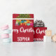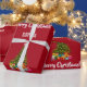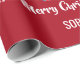 Modern Christmas gift wrap for kids, with a Christmas tree decorated with baubles, lights, and candy canes; the greeting "Merry Christmas" in stylish typography; and a personalised name. On a Xmas red background.
