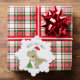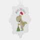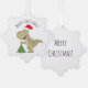 This funny Merry Christmas Ornament Card features cartoon illustration of the cute Dinosaur wearing a Santa Hat and decorating the Christmas Tree. The illustration is designed in traditional Christmas colours: green, red, yellow. Back of the ornament has a customisable text: "Merry Christmas!".
