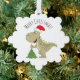This funny Merry Christmas Ornament Card features cartoon illustration of the cute Dinosaur wearing a Santa Hat and decorating the Christmas Tree. The illustration is designed in traditional Christmas colours: green, red, yellow. Back of the ornament has a customisable text: "Merry Christmas!".