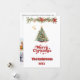 A white background, red text and photo on the front. Decorated with a Christmas tree and a pine garland with red poinsettia flowers. Your text and names on the back. Merry Christmas is written with a retro style font.