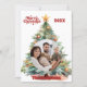 A white background, red text and photo on the front. Decorated with a large Christmas tree. Your text and names on the back. Merry Christmas is written with a retro style font.