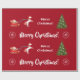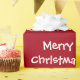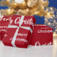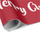 Modern Christmas giftwrap with the words "Merry Christmas" in stylish typography, snowflakes, an illustration of a unicorn pulling Santa in his sleigh, and a Xmas tree. On a red background. Note that you can personalise the smaller greeting with the name of a kid.