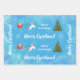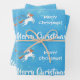 Modern Christmas giftwrap with the words "Merry Christmas" in stylish typography, snowflakes, an illustration of a unicorn (with a mane and tail with red and golden glitter) pulling Santa in his sleigh, and a Xmas tree. On a blue background with snowflakes. Note that you can personalise the smaller greeting with the name of a kid.