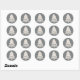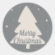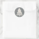 This modern round sticker features a white pine silhouette with little white snowflakes on a silver-grey background.