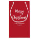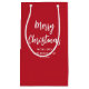 This design features a Merry Christmas calligraphy script gift bag with a simple cute red and white, a minimalist minimal classic whimsical, fun festive bright bold red, simplistic basic plain red white, merry Christmas greeting saying, a custom customised personalised from, a cute whimsy gift wrap bag, Christmas holiday gift wrap supplies, Christmas holiday wrapping supplies