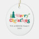Round ceramic ornament featuring the text "Merry Christmas" in colourful, retro font and customisable family name and year. On the back is a template for your custom photo.