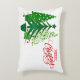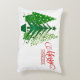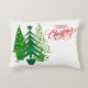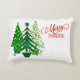 Decorate your home for the holidays with this white pillow with a grouping of three potted simulated green foil Christmas trees in three shades of green that are trimmed with simulated gold. The words "Merry Christmas" appear in red on front and back with two different fonts and a different layout on each side of the pillow.