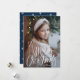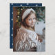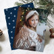 Cute holiday photo card with "Merry Christmas" featured at the bottom of the card in a white handwritten script. Personalise the whimsical Christmas card with your vertical photo and family name. The card reverses to a navy and white snowflake pattern.
