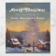 Beautiful red cottages on a snowy Christmas Morning. The Sun rises and enhances a very big, beautifully decorated Christmas tree.