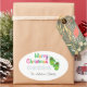 This oval Christmas sticker features a pair of winter mittens and the wording Merry Christmas. The text is multi coloured: Green, orange, blue, pink, purple. The design is accented with a line of snowflakes underneath the text. Customise with your name.