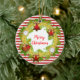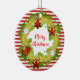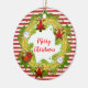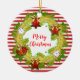 Round hanging ornament features Merry Christmas text in holiday wreath on red and white striped pattern.