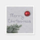 "Merry Christmas" written in the snow with a decorative red Christmas tree ball and a snowy fir branch.