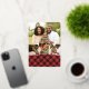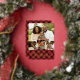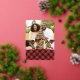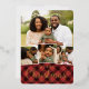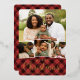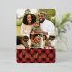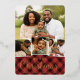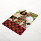 Festive holiday photo card features four of your favourite images arranged in a collage layout. "Merry Christmas" appears beneath in gold foil lettering, along with your names and the year, on a red plaid background.
