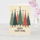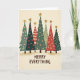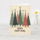 This cheerful and folksy holiday card features a charming group of seven stylized Christmas trees. Each tree boasts a unique pattern, including polka dots, stripes, snowflakes, and zigzag designs, rendered in a warm color palette of deep greens, reds, pinks, and gold accents. Every tree is topped with a spiky golden star, adding a touch of rustic whimsy. The festive scene is set against a creamy, neutral background, and the card carries the inclusive message "MERRY EVERYTHING" in bold, friendly capital letters. Spread joy this holiday season with this perfect card for spreading holiday cheer!