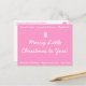 Send a little happy holiday greeting with the "Merry Little Christmas" postcard by April McCallum. Light Pink postcard with whimsical white font. Main Text: Merry Little Christmas to You! Additional Text: Twinkle Lights, Gingerbread Houses, Sleigh Rides, Christmas Stockings, Peppermint Kisses, Hot Cocoa. Everyone loves a postcard!