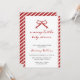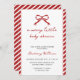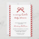 "A Merry Little Baby Shower" holiday baby shower invitation, Featuring classic red and white candy cane stripes and a charming holiday bow, this design is perfect for a gender neutral winter baby shower. The elegant typography adds a modern touch to the traditional Christmas colours. Customise the text to fit your event details and make it all yours.
