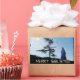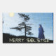 Female figure in hooded cloak on a hill with full moon, gold stars, and a solitary winter evergreen. The words wish you a "Merry Solstice."
