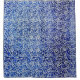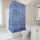 Mess of small squares, shades of blue with white shower curtain