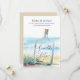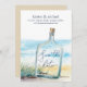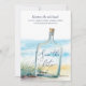 Uniquely styled wedding save the date card features a watercolor beach scene with a "message in a bottle" bearing the words "save the date" in chic handwritten script typography. Personalise with your names and your beach or summer wedding details at the top, including date, location, and wedding website.