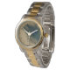 Very good quality watch that looks good whether dressing up or down. The band is sturdy. The watch is rather large so might not work for smaller folks. Recommended as a good gift. Printing is just a touch light but adds a nice touch of personalization.