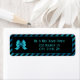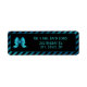 This return address label features a metallic blue bow on a black coloured centre and the background is metallic blue and black diagonal stripes. The text on this label can be customised and used as either a return address label or can be used as a gift tag!