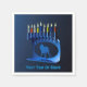 A modernistic, metallic blue dreidel against a dark, night-like background. Two of the Hebrew letters found on a dreidel, nun and shin, glow brightly. Add your own text.