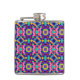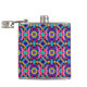 Metallic flask with vibrant geometric pattern in blue, pink, yellow, and purple. Bold design with overlapping shapes on the front and left view.