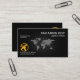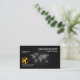 Card features a black cover with an underlying world map against a metallic grill. A vignette is used to accentuate the design. Your prestigious name and job title are at the top right corner. Westwards to this, is a slogan option to advertise your services. Directly underneath this are your logo and its contact details.'