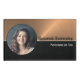 This professional magnetic back name tag features a name in black on the flared faux copper background and below the title in white centred over a black background with a template photo. Personalise the text fields or click customise to select a font style, size, and colour you prefer. Replace the photo with yours. A square photo works best.