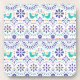 This folk art design features a bird surrounded teal, purple and orange geometric tile pattern.