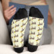 This awesome pair of patterned crew socks features a pale brown donkey with a dark brown mane and tail. The Donkey is ready to celebrate the Day of the Dead, Dia de los Muertos. The Donkey is wearing a sombrero covered in red and green stars, carrots, colourful swirls, cherries and red and green chillies. There is a flower with orange petals and a yellow centre in the middle of the hat, called a Tithonia, or Mexican sunflower.
