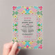Set the tone for your Mexican Fiesta-themed rehearsal dinner with this stunning transparent acrylic invitation. Featuring a vibrant folk art design with colourful florals and birds, this invitation captures the joy and charm of a traditional fiesta. The transparent acrylic adds a modern and elegant twist, making it perfect for couples celebrating with a mix of tradition and contemporary flair. Fully customisable to fit your unique event.