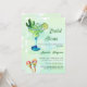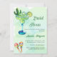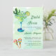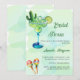 A green watercolored background decorated with watercolored cactus, a large green and blue glass with a Margerita coctail, colourful maracas Personalise and the name of the bride to be and details.