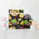 Colourful Mexican food patterned wrapping paper, featuring a variety of traditional dishes from Mexico including tacos, burritos, enchiladas, refried beans, empanadas, fajitas, tamales and more