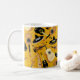 Fun Mexican Mariachi music inspired cartoon patterned mug. Featuring illustrations of guitars, sombreros, harps, trumpets, and violins on a golden yellow background.