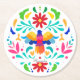 Beautiful and colourful, this otomi, Mexican design has a multicolor bird in the centre with red flowers atop and bottom and teal leaf elements at four corners. Last name template.