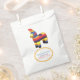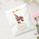 Fun white paper favour bag with graphics of a colourful donkey pinata. A yellow scallop edged oval text area, has colourful text ready to personalise for your fiesta style event.