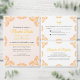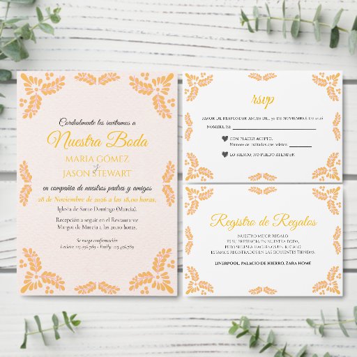 This Mexican Talavera Yellow Floral Minimalist Wedding Invitation design features a minimalist approach with delicate, symmetrical orange yellow motifs placed in each corner and along the edges. The small, leaf-like shapes create a sense of movement while maintaining an airy, open space in the center, allowing for ample text placement. The simplicity and elegance of the pattern evoke traditional Talavera tiles, giving the design a classic Mexican artisanal feel.