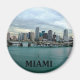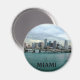 Landscape photograph of the Miami Florida skyline as viewed from the water. A ship is in the foreground. In the background is the city skyline and bridge against a cloudy sky and setting sun. Excellent Miami, Florida gift idea for those who love Miami, Florida, skylines, the beach, oceans, or travel. Also beautiful Miami, Florida souvenir or gift for someone headed to Florida on vacation.