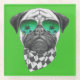 This design features a portrait of pug in with sunglasses and a black and white chequered scarf.