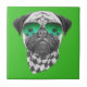 This design features a portrait of pug in with sunglasses and a black and white chequered scarf.