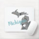 Michigan Floral Filled Silhouette Mouse Pad. Michigan Floral Filled Silhouette With "Michigan" in cursive Typography. A great gift for any Michigander at heart. This mouse pad has the Michigan silhouette filled with a poppy floral pattern in grays and blues with a white heart. Design by The Michigander.