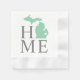 Stylish paper napkins feature a typography design with "Home" text and Michigan state map. The navy blue heart city marker can be positioned over the city where you live or your home town via Customise. Charcoal grey, jade / mint green, and white colours.