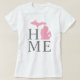 Stylish shirt design features a typography design with "Home" text and Michigan state map. The heart city marker can be positioned over the city where you live via Customise. Girly pink, charcoal grey, and white colours.
