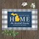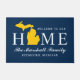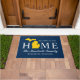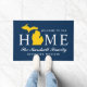 Stylish "Welcome to our home" doormat features a typography design with state of Michigan map. Personalise with your family's last name monogram and your city name. Navy blue, maize yellow, and white colours can be customised.