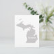 A postcard featuring the outline silhouette map shape of the Wolverine state of Michigan filled in solid grey with the word home inside.