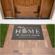 Stylish "Welcome to our home" doormat features a typography design with state of Michigan map. Personalise with your family's last name monogram and your city name. Includes a burlap background layer with a rustic textured appearance. Neutral colours include dark taupe grey, warm grey, and white.