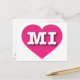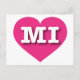 This postcard features a vibrant hot pink heart containing the bold, white, upper case letters MI, the official abbreviation for Michigan, the Great Lakes state. The reverse side of the postcard is blank, awaiting your customised text or handwritten sentiments.