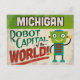 A funny Michigan vintage travel postcard featuring a friendly robot with fun retro style text that says, "Michigan, Robot Capital of the world!"