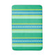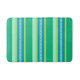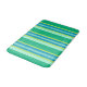 Bath mat in classic, Mid-Century Modern awning stripes in Soft, blended colours, with a centre trellis pattern accent stripe, in light and deep jade green with turquoise and lime green accents